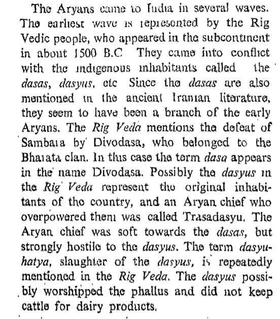 - After stating “They (Rig Vedic Aryans) came into conflict with the indigenous inhabitants called the dasyus, dasas”, in the very next sentence, the author shifts to says dasas may be a branch of early Aryans. A very quick shift in the definition of the term, indeed.